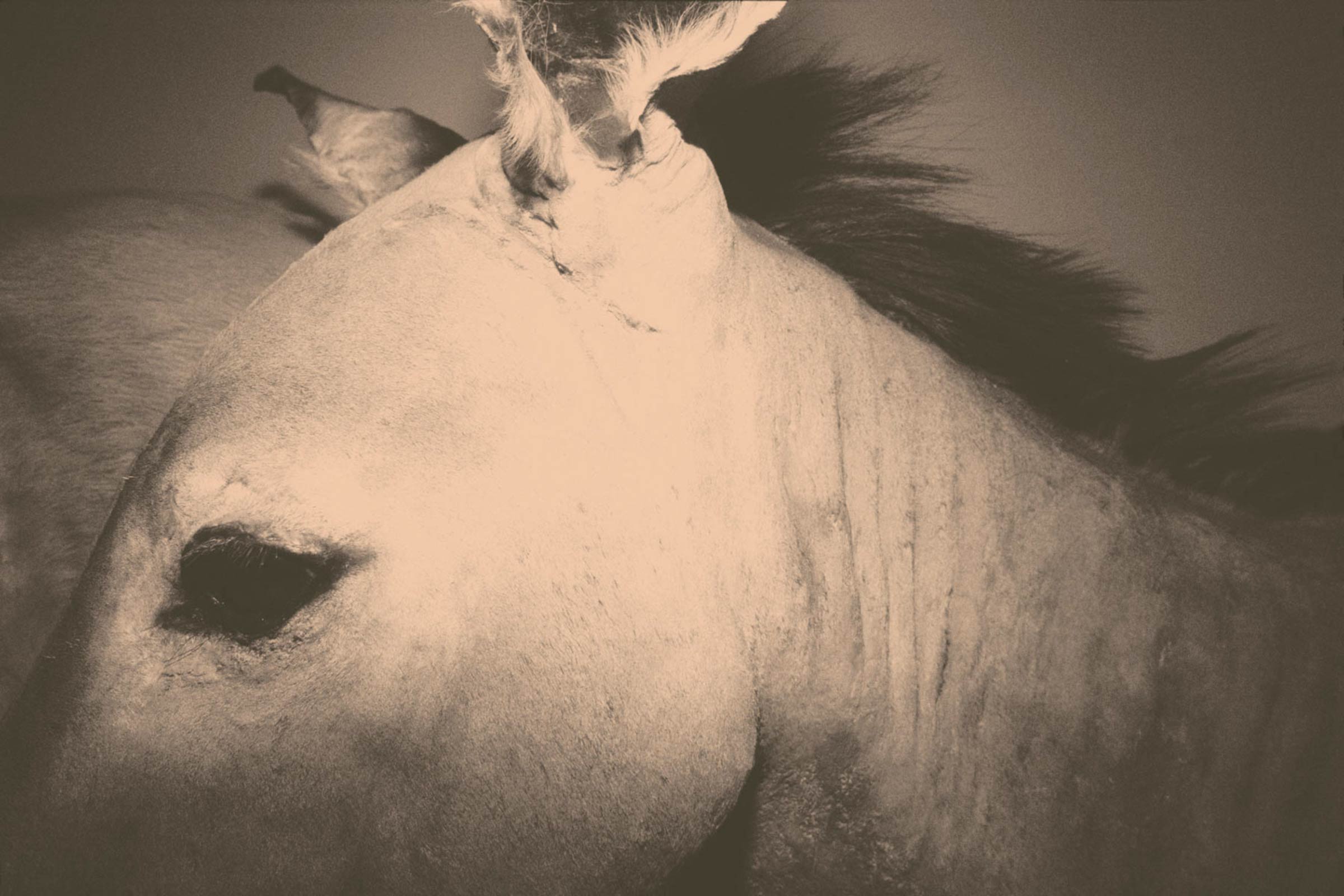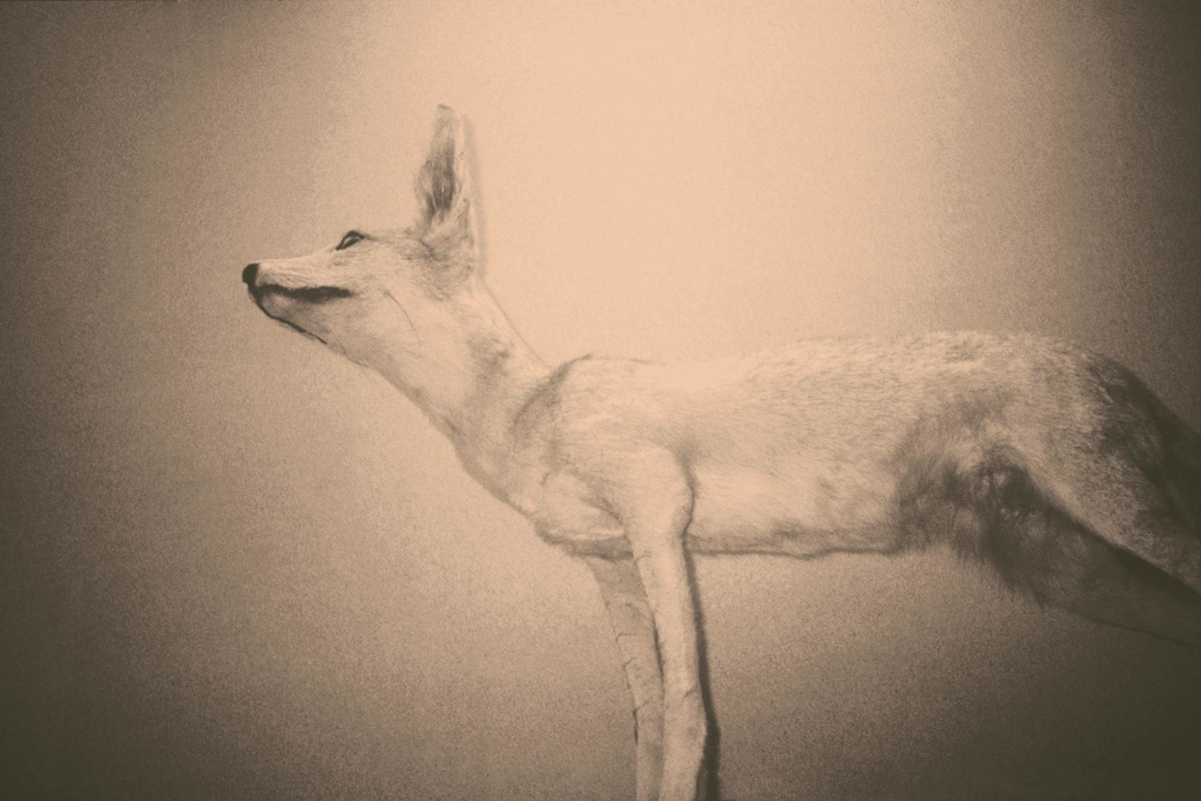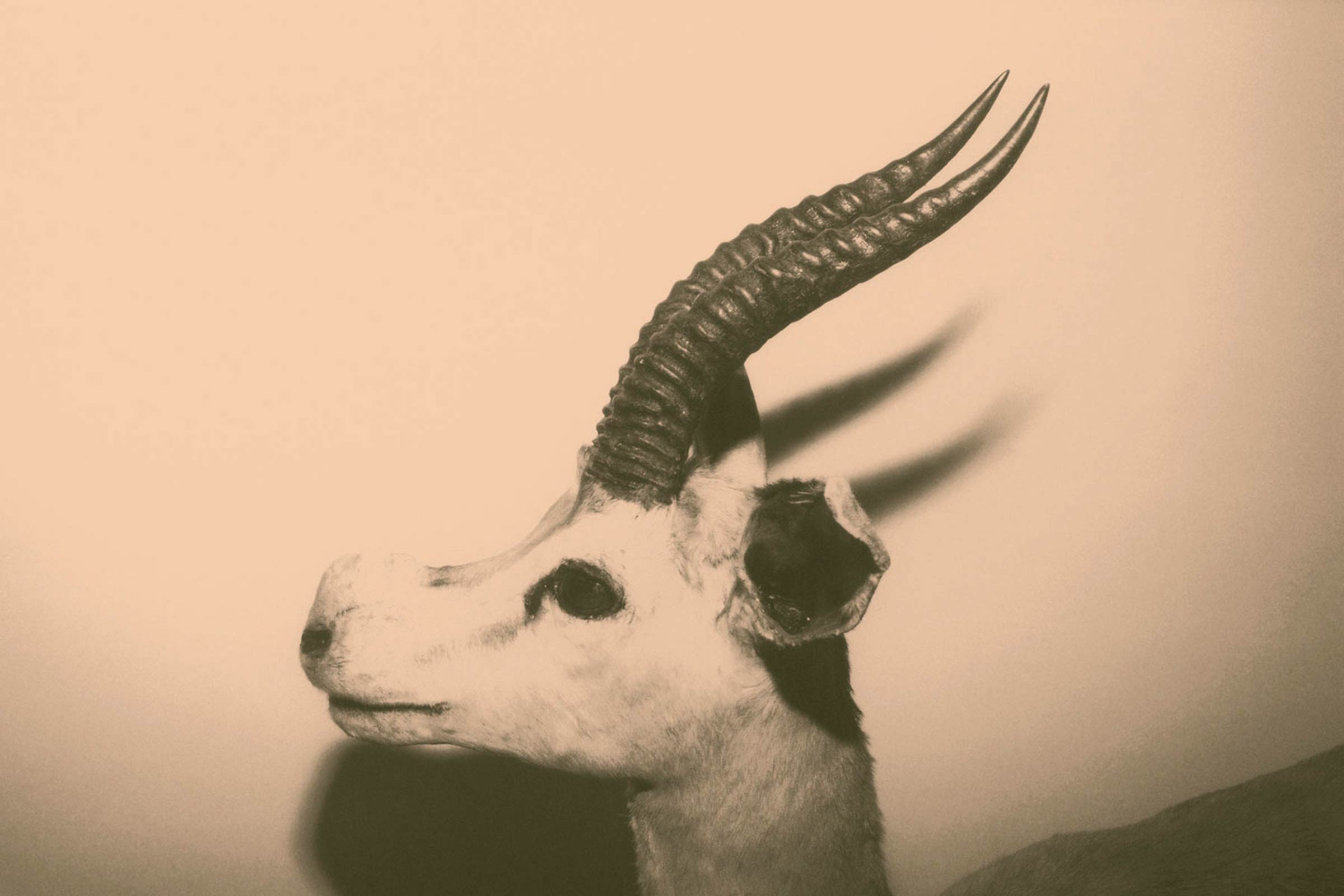 Broadly speaking, Andrea Ferrari’s latest project is concerned with taxidermy: the process of artificially reincarnating dead creatures to stand in an eternal facsimile of life. In Wild Window, currently showing as part of Paris Photo, we are presented with the long dead forms of an antelope, a gauzy headed bird, an array of beetles, the beheaded torso of an okapi; trophies of the age old human passion for demonstrating domination over, as well as interest in, the natural world. Yet Ferrari’s work does more than simply catalogue these museum pieces; rather, using light and a bleached out palette, he imbues them with an uncanny animation, forging sculptural creatures that are both dead and alive. Glass eyes sparkle in the flash bulbs, shadows add movement, disjointed framing create the impression of an animal disturbed mid-graze. We are both assured of the falseness of their life force, yet unconvinced that they are stuffed. As Laura Gasparini describes in her accompanying notes, “Nature and artifice meet in the shadow and become amazement.”